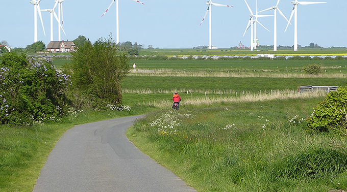 In Schleswig-Holstein führt die Strecke von Hamburg zuerst entlang der Elbe bis Brunsbüttel, von dort über Büsum, St.Peter-Ording, Husum, die Halbinsel Nordstrand und Dagebüll weiter nach Dänemark. Es geht vorbei durch Marschen und Köge, an Deichen und Buchten. Mit Rückenwind am Deich entlang rollen, die Nase an der gesunden salzhaltigen Luft – das ist Radeln auf dem Nordseeküsten-Radweg.