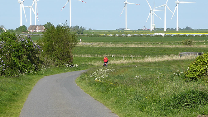 In Schleswig-Holstein führt die Strecke von Hamburg zuerst entlang der Elbe bis Brunsbüttel, von dort über Büsum, St.Peter-Ording, Husum, die Halbinsel Nordstrand und Dagebüll weiter nach Dänemark. Es geht vorbei durch Marschen und Köge, an Deichen und Buchten. Mit Rückenwind am Deich entlang rollen, die Nase an der gesunden salzhaltigen Luft – das ist Radeln auf dem Nordseeküsten-Radweg.